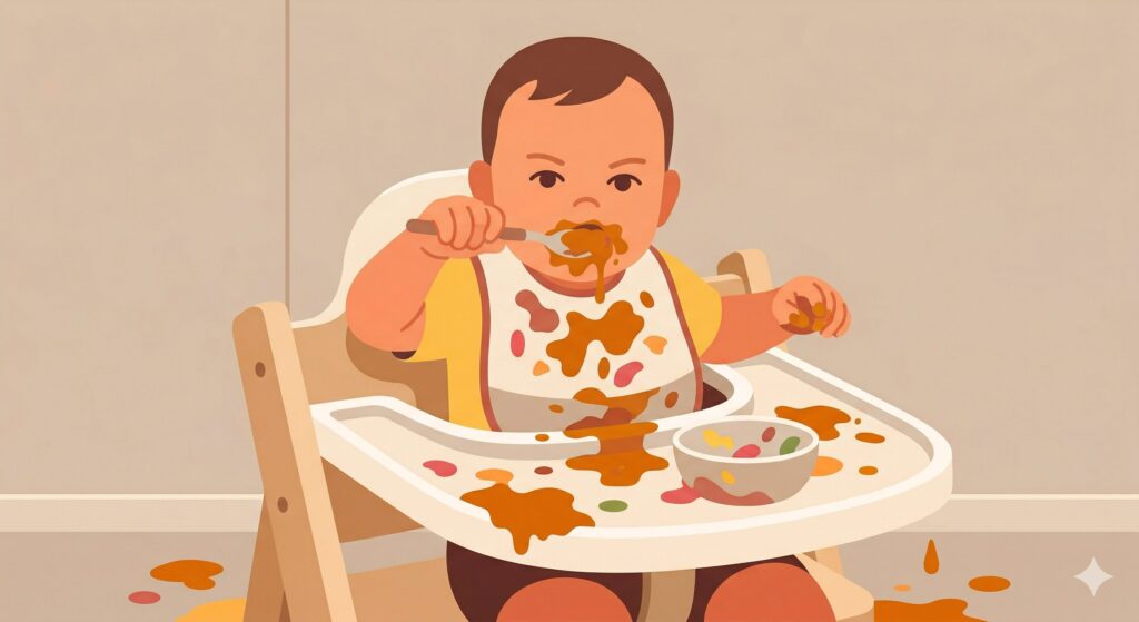 うちの娘もスプーンデビューの時は、服も顔もカレー色になりました(笑)。それでも「自分でやりたい!」という気持ちを尊重し、見守るように意識しました。