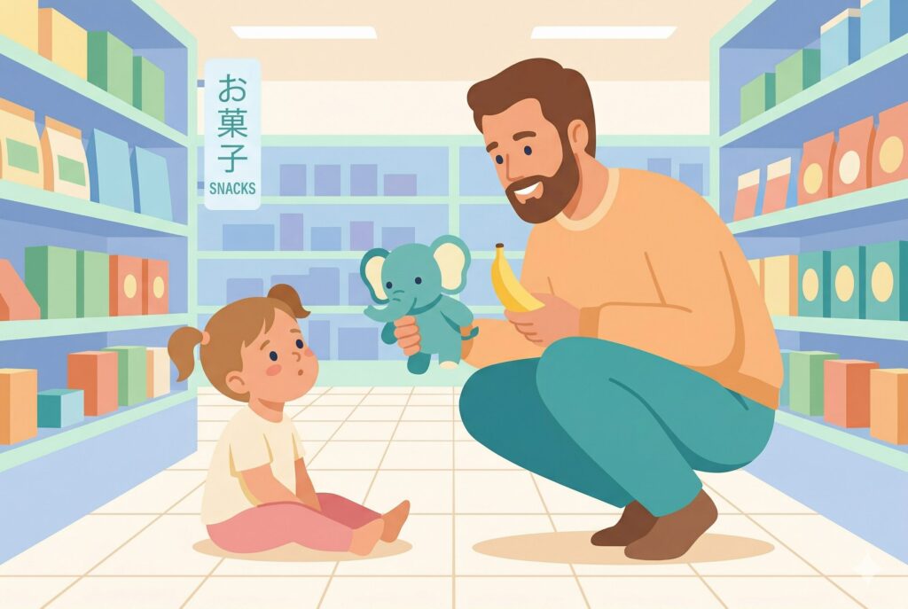 結果:自分で「抱っこ!」と選び、泣き止んで買い物が進みました。自分で選ばせることが大切だと痛感した出来事です。