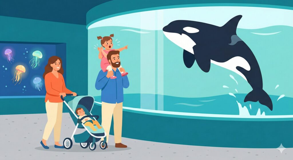 クラゲの展示に目を輝かせ、シャチのショーでは拍手。
