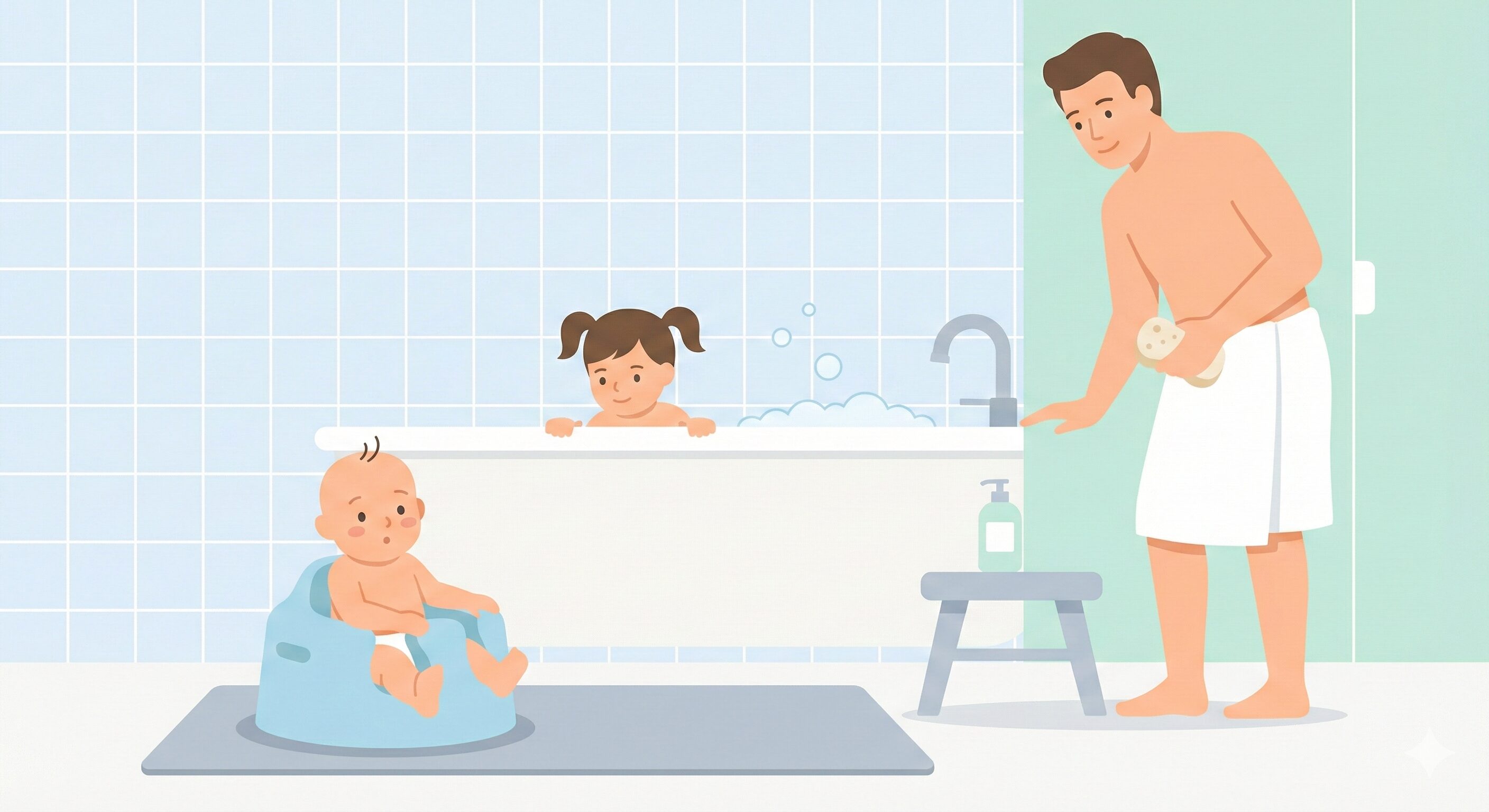 この2人を私(パパ)ひとりで入れるわけですが、最大の課題は「0歳児の待機場所」でした。