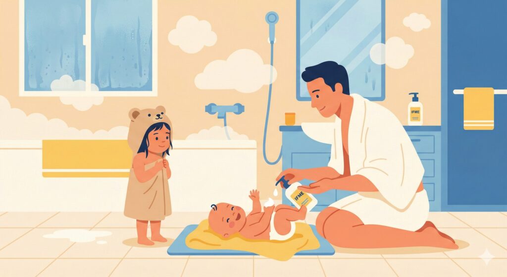ちなみに、我が家で愛用している「IFME(イフミー)スキンケア ベビーミルクローション」は、ポンプ式で出しやすく、濡れた手でも扱いやすいので「浴室内保湿」には最強の相棒です。