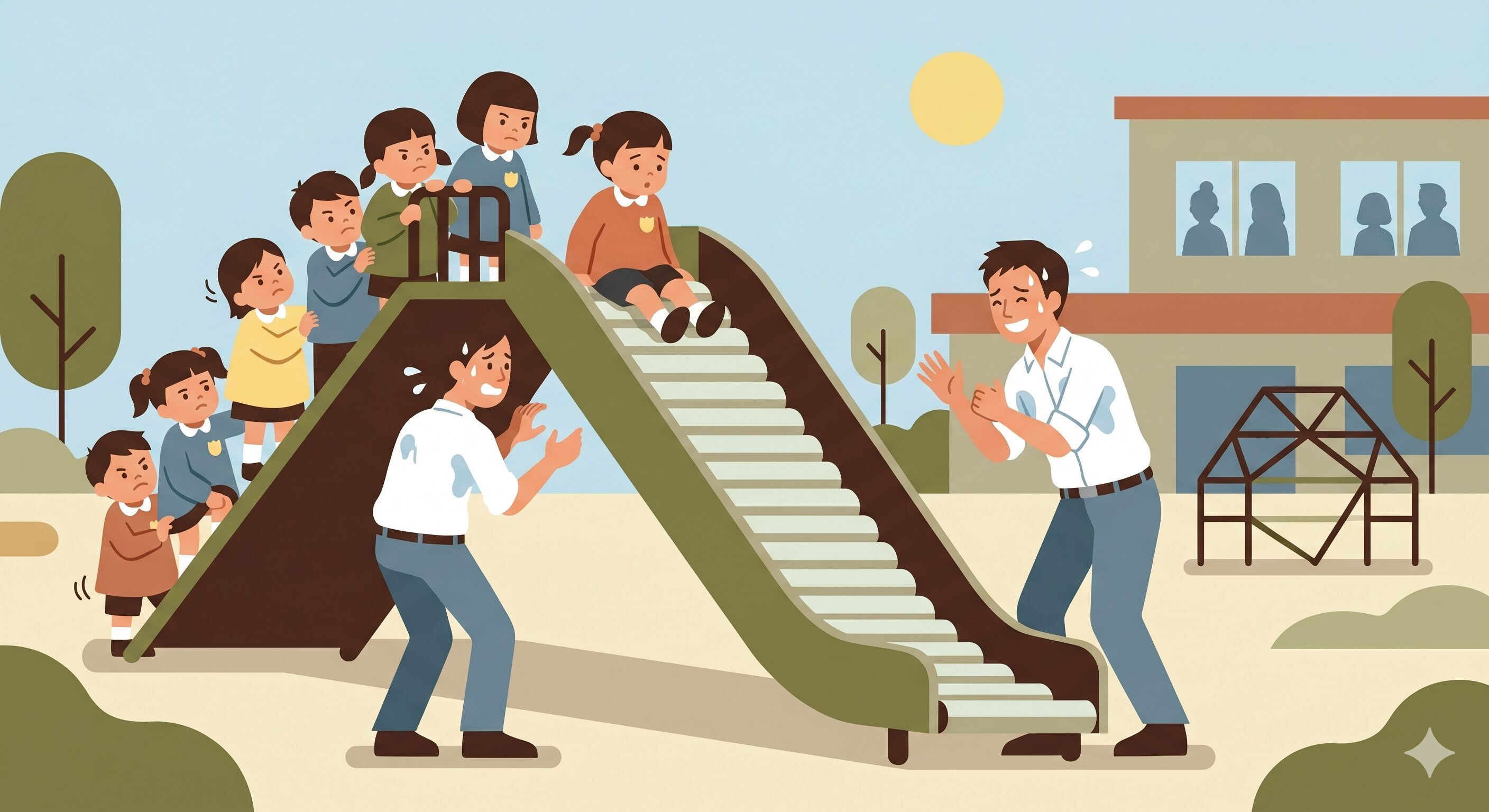 我が家は妻が教室に残り、私が長女と一緒に校庭へ出る「外遊び担当」に。ぽかぽか陽気の中、楽しそうに遊具へ向かっていく長女の背中を微笑ましく追いかけていたのですが……本当の試練はここからでした。