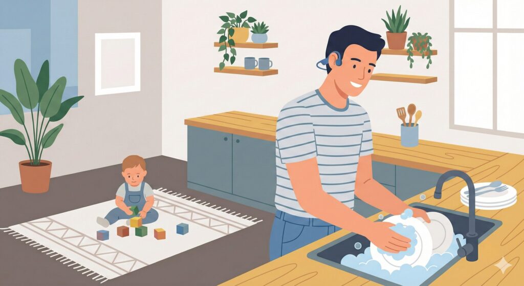 骨伝導イヤホンで、好きな音楽やラジオを聴きながら家事をする。耳が楽しいだけで、おむつ替えや皿洗いの苦痛がかなり和らぎます。子どもの声もちゃんと聞こえるので安心です。