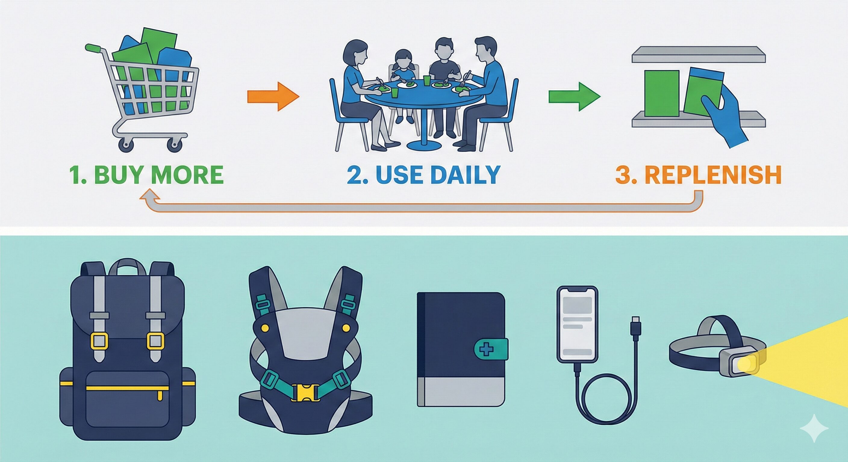 特別な「防災食」を買うのではなく、普段食べているベビーフードや、飲み慣れている麦茶を「多めに買う」だけです。