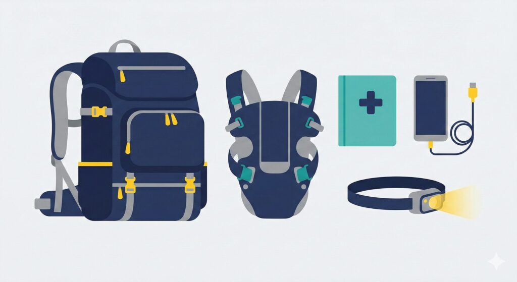 - 抱っこ紐:避難時の移動はベビーカーNG(瓦礫で通れない)。両手が空く抱っこ紐一択です。