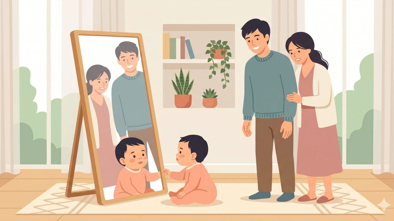 生後半年ごろの赤ちゃんは鏡に興味津々。鏡の中の顔に向かってニコッと笑ったり、手を伸ばしたりして本当に可愛いですよね。